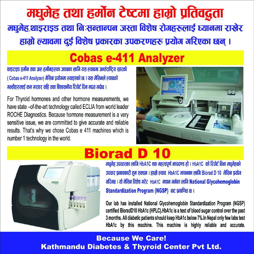 At Kathmandu Diabetes and Thyroid Centre Pvt Ltd we believe that every patient deserves accurate and reliable results. Our lab is well equipped with advanced and state of the art technology.The Rosche cobas e411 machine is a bench top analyzer for heterogeneous immunoassay. Cobas e 411 offers an on-board capacity of 18 tests and throughput of up to 88 tests per hour. This analyzer’s Electrochemiluminescence (ECL) technology provides superior analytical performance. The very wide measuring range facilitates cost and time efficient testing by reducing the need to dilute and repeat samples. A wide variety of endocrinology assays can be done in this reliable and efficient machine.
